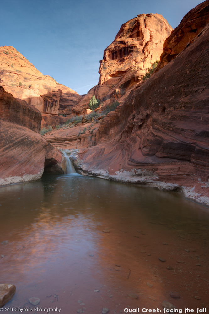 I posted an image online that I thought showed a very unique perspective. I was in southern Utah in February exploring some of the new wilderness areas around St. George. In particular there is a large swath of redrock desert that acts as a transition area of sorts between the Basin and Range expanse, the Colorado River Plateau and the Mojave Desert. Called Cottonwood Canyon Wilderness Area, it is generally dry but there is this one stream – Quail Creek – that flows from the Pine Valley Mountains and eventually joins the Virgin River downstream from Zion National Park. I spent the better part of a morning photographing the small pools and even smaller waterfalls against the soaring red walls. Over one particular short fall I positioned myself to capture the water as it flowed between the five legs of my tripod and me and out and over the rock wall. Using a 10mm at f/22 the angle is extreme capturing the scene literally inches in front of my toes, the tumbling water just beyond and below, the pool. Once posted on Flickr, I had several people comment that the perspective was very strange, to the point where they had a hard time figuring out what they were looking at. To them, it seemed that the water was flowing out of the pool (downward in the photo) and not the reverse. Once I understood what they were seeing, I of course started seeing the image that way as well. In fact, it is kind of like one of those optical illusions where you see a lamp stand then two people facing each other and then the lamp stand again and then…well, you get the idea. Of course there is no ‘fixing’ of the photo this time around, just the oscillating behind two ways of seeing it.