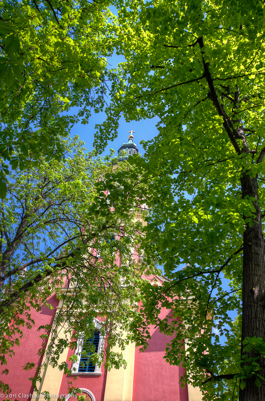 The Brandt guidebook, and to an even larger degree, The Rough Guide, were effusive in their praise of this small town. I could see the promise, but for me, the reality fell short. It all seemed rather tatty with massive amounts of graffiti adorning walls and buildings. It probably didn’t help that there was some sort of street ditch-digging that contributed a coating of dust to much of the town. The main town square – F?? T??r – was small, angular, sloping and seemed a singular place with its crowding of old burgher houses. We enjoyed a light lunch on a bench watching the tourists, but frankly I found nothing in the square to photograph. Wandering uphill we found two unique church yards that offered a study in contrasts. The Roman Catholic church, creamy yellow and dirty white, sat in a large, open flat hill upon Templon T??r partially surrounded by skeletal trees that made for some interesting compositions. The Belgrade Cathedral – a Baroque Serbian orthodox church – is located in a beautiful enclosed park crowded by bright green, tall trees. The church itself is painted in ochre and pale mustard and the grounds made for a nice cooling spot to sit out of the warm mid-day sun. Photographing the church through the dappled greenery made for some challenging fun, though the end results don’t quite live up to the initial promise.