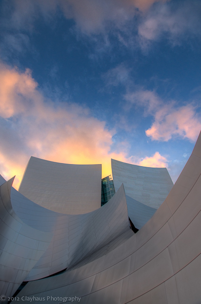 Certainly one of the most oft-photographed Gehry creations has to be the Concert Hall in Los Angeles. Like a beached futuristic Ark of alien design, it sits upon a hill, positioned between the older, New Formalism style architecture of the Dorothy Chandler Pavilion and the imposing high rises of Bunker Hill. I have enjoyed shooting there on several occasions with both infrared and visible light cameras. On my latest trip to L.A. we arrived an hour or so before sunset ?? an ideal time ?? and were rewarded with smoky clouds as backdrop. The soft billows and hard-edged planes both caught and threw back the changing light as the sun dropped lower. As usual, selecting a few representative images from the many is a challenge: a slight change in angle or in time of capture yields a whole new interpretation. Infuriatingly, the management of the Concert Hall permit no tripod usage on the block the building sits upon. (If you want to use 3-legged support, you must cross to the other side of one of the streets.) This is fine for relatively shallow depth of field images, but the building demands a least a few sweeping wide-angle, extreme DOF photographs. Even without a tripod, with a combination of my Pentax camera’s built-in shake resistance, timed breathing, and the creative use of the building itself for support, I was able to capture the f/22, near-to-infinity drama shots I was looking for.