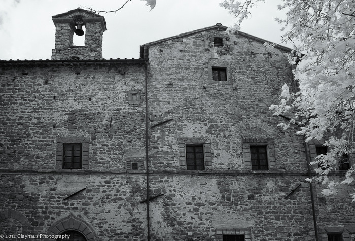 Passing through the stalwart portal, the light goes dim as the think walls shield from sun and arrows alike. On the inside are gun ports offering a wide range of fire on potential hostile guests. Into the main courtyard — for clearly that’s what it was — I can now see how complete the transition has been from ancient castello to working villa. There is a barn-like structure to the west, on the brow of the hill and the portal I passed through is now part of three story living quarters. What affairs — both intimo and politico — have been conducted behind those green shutters? Did troops mill about or bivouac under smoky fires in this courtyard? Did clerics argue and prattle on about holy business whilst enjoying the Tuscan sun and perhaps a glass of the local quaff? The main entrance lays before me: a heavy brown door, protected by a gun port, a door bell, and above, a belfry. No Proprietà Privata or the even more ubiquitous Attenti al Cane signs decorate the castle walls, so I feel free to loiter and linger a bit longer. Treading back down the lane whilst the blustery wind kicks brown leaves into mini whirlpools, I can only wonder…