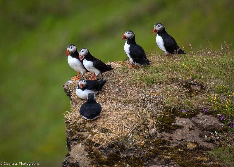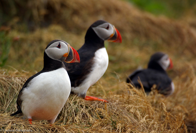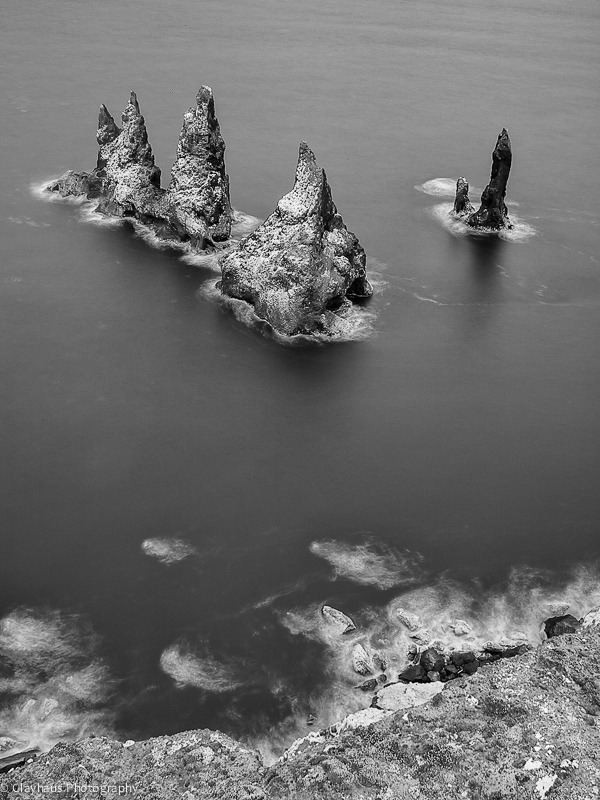 Close by Vík are a set of basalt sea stacks known as Reynisdrangar. They rise from the stormy north Atlantic sea like the petrified masts of some ancient man-o-war. In fact, there are three similar legends related to them and at least two feature a ship. The most colorful tells the story of three trolls — Skessudrangur, Laddrangur and Langhamar (but I think of them as Larry, Moe and Curly) — who, whilst trying to drag a ship to shore, are caught, turned to stone and frozen in time and place by the rays of the dawn’s sun. The stacks are very photo-genic from either the black basalt sand beach to the east or the high cliffs of Reynisfjall, directly above. If the weather is relatively calm (all things being relative here), you can lie upon the edge of the cliffs watching the puffins wheel about in the void between you and the stone trolls.