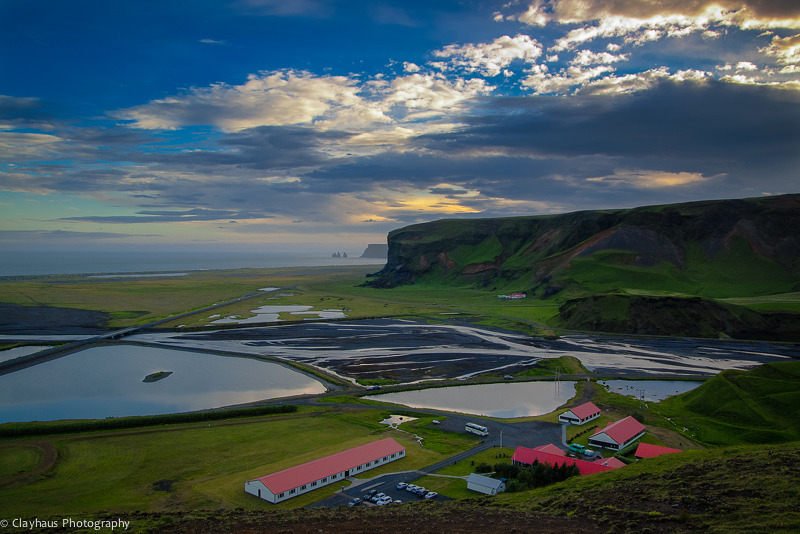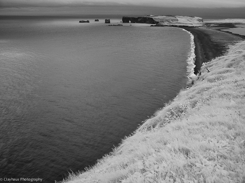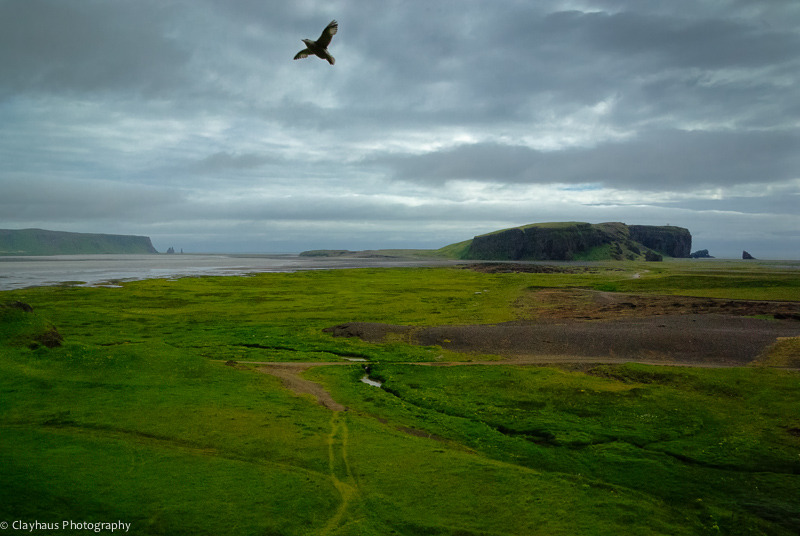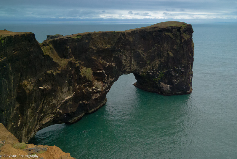 From those same cliffs, much further to the west, a headland thrusts into the sea, with a quite large puncture mark in the rock. Dyrhólaey it is, meaning, “the hill-island with the door-hole.” Tour boats will float through the opening and a stunt pilot is said to have flown through it as well. The cliffs are crowded by puffins and the view from the edge of the promontory is spectacular if not vertiginous.