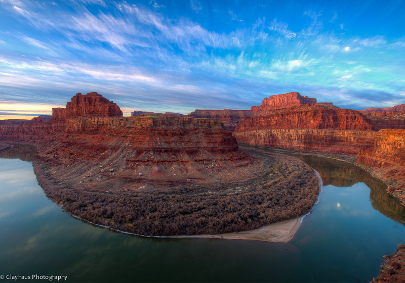 I arrived shortly before the sun was to rise and it quickly became obvious that I would need to adjust my expectations. The seasonal difference of three months meant that the sun was in a different position. The rearing bulk of the Gooseneck was in fact not reflected in the river and therefore I would have a different play of light off of the cliffs. The soft reddish-orange light was instead reflected off of the west side cliffs as was the glow of a gibbous setting moon. Adjusting should be no problem for a photographer, and so I did.