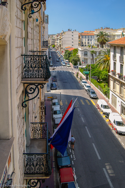 If ever in Nice, France, a stay at the Hotel Windsor is recommended. The rooms are wildly painted, each with its own special treatment, and the elevator makes a rocket launch sound when ascending. I know: it sounds gimmicky. Perhaps it is, but it also works. This view out our window is not terribly remarkable, but for me captures the warmth and light of the south of France, in an urban setting.
