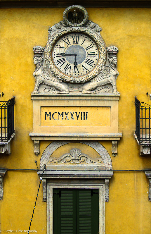 We stayed two nights in a tiny, cramped room in Verona, Italy. The hotel was not bad and was ideally located just around the corner from the Roman arena that is still used — for concerts, not slaying Christians. Our room looked straight out across a very narrow alley to this remarkable clock with the date 1927. The winged lion of St. Mark is seen all over the Venato region, but these lions are rather un-Christianly well-endowed, methinks.
