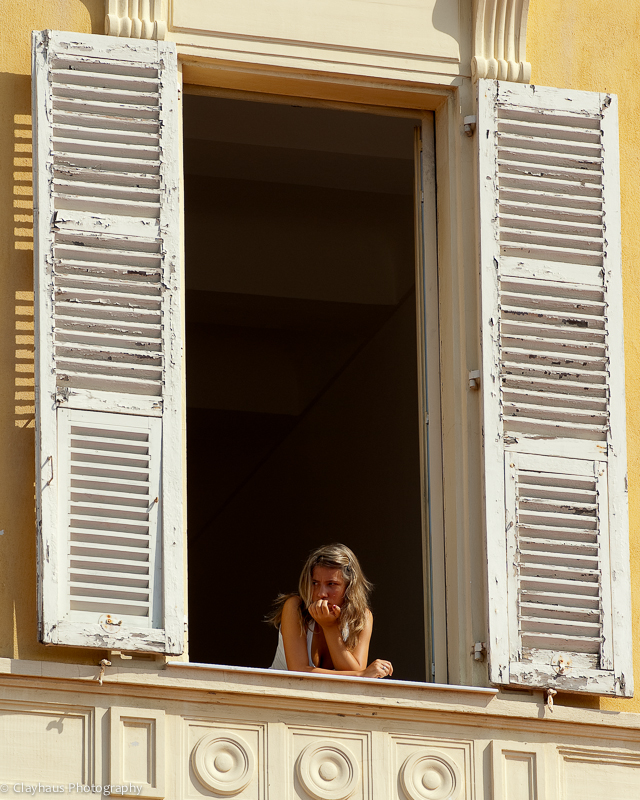 In town squares or walking down village streets I will often scan the buildings, looking for those watchers with their elbows propped on the sill. In Nice, France on market day, whilst all the hustle-bustle, selling and bargaining was going on below, this young woman, framed by the huge window and paint-deprived shutters, gazed to and fro, not looking but seeing. I often play the game of wondering about their lives. But game it is, as I’ll never know.