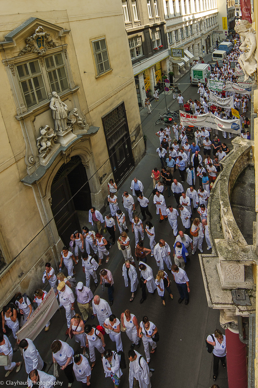 The day we arrived in Vienna, Austria, we threw open our windows — it was exceptionally warm and muggy that May day — to see thongs of white-clad people streaming below our pension, carrying banners but walking in a dignified, quiet manner. Apparently they were health-care workers protesting cut-backs. The power of the many on display, though I don’t know if they were actually successful in their attempt.