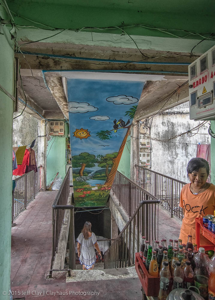 After walking on the ground level perhaps a third of the length of the building, Naomi leads us up a stairwell where laundry hangs drying, and in doing so offers a bit of bright and gay color to the otherwise once-white building facade. The underside of each flight of stairs are painted incongruously with sunny happy scenes. I am told that they represent the “ideal world.” The juxtaposition of them with the building’s grit is substantial.