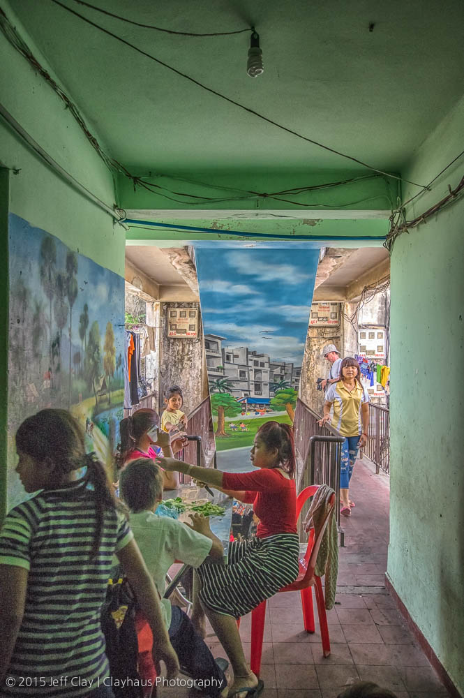Life is drawn to light and teems on those stairwells: kids running up and down, adults selling sodas, prepping vegetables for the pot, grannies just hanging out. Stretching away from the light are those long dark corridors. A bilious yellowish-green hue, ripe with the swirling and sometimes conflicting smells of cooking and living, the corridors are dim and grow long between the wings of the building. Walking the halls one sees the small apartments, many with open doors for cross-ventilation. Peaking but trying not to intrude, microcosms of life appear: someone cooking the noonday meal, a radio blaring, a baby being bounced, sandals in the entry way, a thin mattress on the floor. Halfway along I come across dead zone stairwells; dark, strewn with rubbish and barbed wire, they must have gone somewhere at sometime. Eventually, a door lets out onto the upper rooftop and back into the bright, fresh air we emerge.