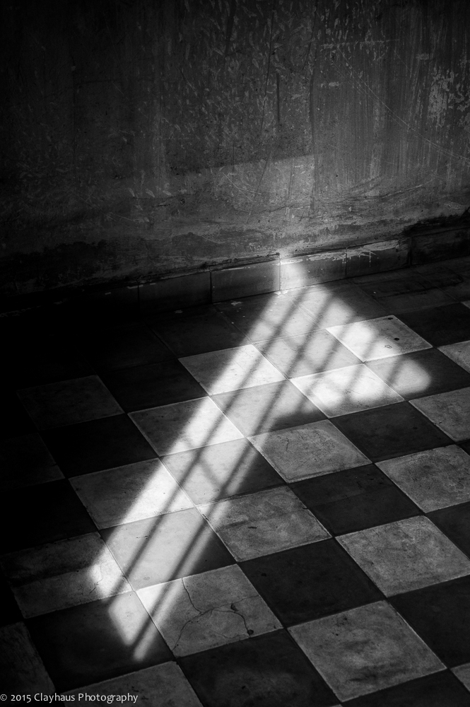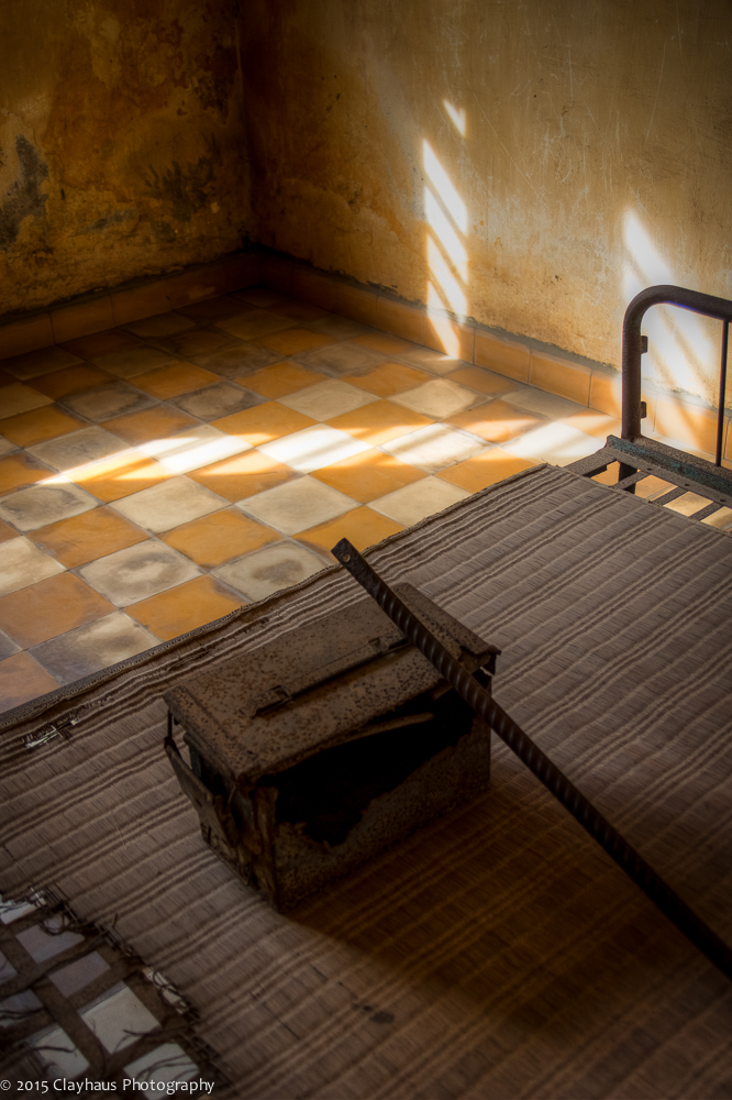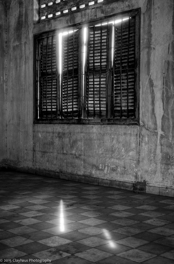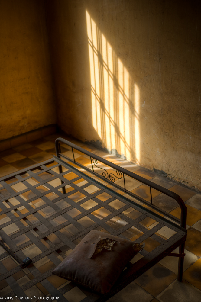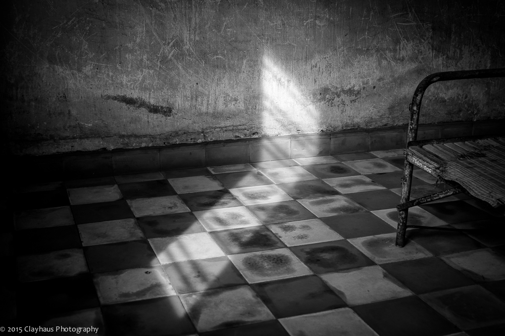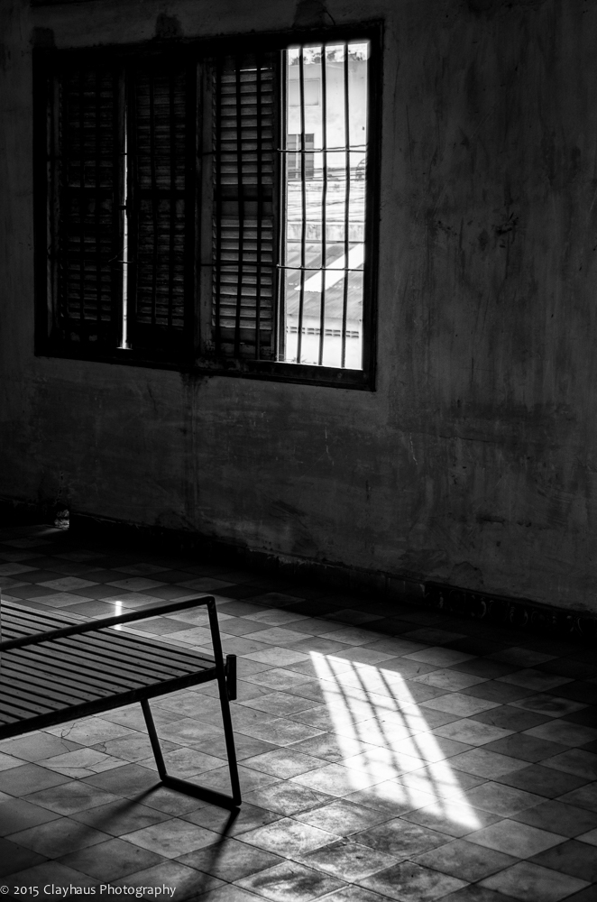 I photographed the buildings and rooms, the beds where inmates were shackled and died. The hallways and barbed wire across openings to prevent suicide attempts. Streaks of light coming through barred windows, scratched and grimy walls, and bright green palms with a blue sky wash above, surreal and incongruous. In the end I photographed one of the last survivors, who has written a book and spends his days at his former torture camp and wondered about what he is seen and experienced and wondered about what he now feels. Divided by language — and an urge to flee — I will never truly know.