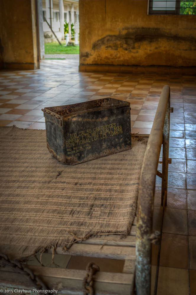 As a good tour guide, Nathan gave a short history lesson and most of the group followed him through the four buildings of the former high school. I elected to follow my own path and my own thoughts. You can read many of the details of S-21, or Security Prison 21, in the Wikipedia link above. This one sentence alone should give pause: “Out of an estimated 17,000 people imprisoned at Tuol Sleng, there were only twelve known survivors.” Stalin — no softie when it comes to mass murder — once quipped, “One dead is a tragedy; a million dead is a statistic.” There is a certain sick truth to this. However, the museum does a good as job as possible personalizing the dead: there are thousands of photographs of the inmates-cum-soon-to-be-dead — taken by the Khmer Rouge, as apparently many murderous regimes like to document their ‘work’ — in one of the buildings. I photographed the photograph of one young woman, wondering what went though her mind? What was I seeing on her face? Resignation? Bafflement? Worry? Did she have any idea where her path now lead and how she got on it? Mostly I just felt sad looking at her, long gone but her suffering also long over.