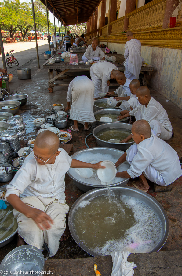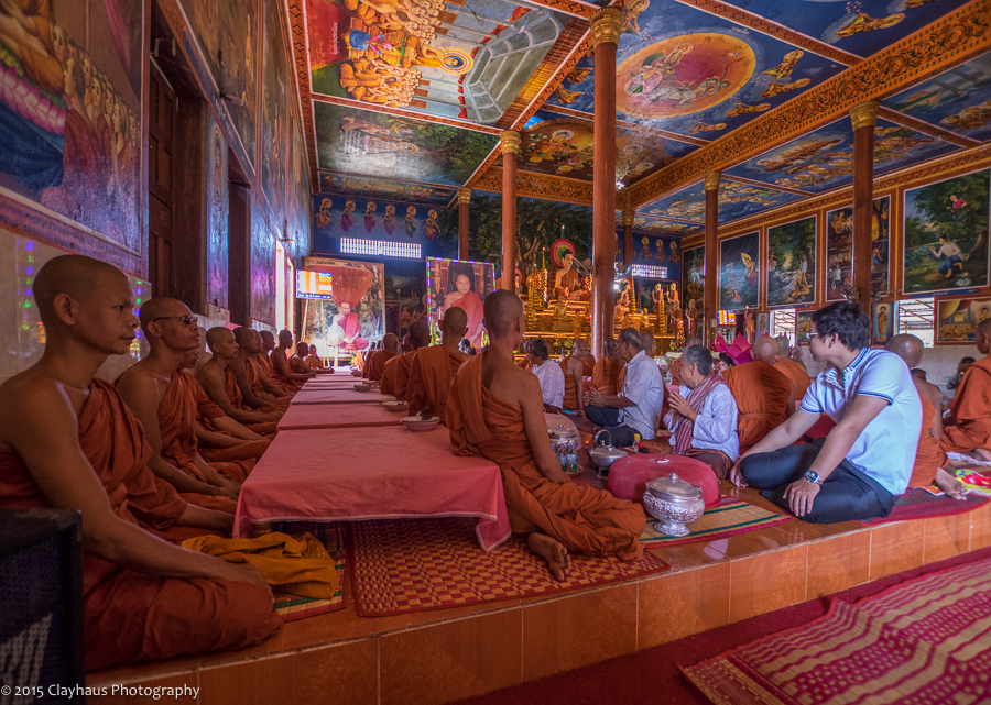 Oudong (also spelled Udong), in the Odongk District, sits just 40 kilometers north of Phnom Penh. One wouldn’t know it by looking at it today, but for 250 years — beginning in 1601 — it was the capital of the Khmer Empire. The Empire itself was in a state of decline and was being pressured from the west buy the invading Thais. Finally in 1866 it was abandoned and the capital moved further southeast (and further away from the Thai influence) to its current location, Phnom Penh. At one time there were hundreds of pagodas and other structures, but a century of neglect took its toll and then the Khmer Rouge showed up and finished off the job. I suppose there must be some old traces of what was once there, but now you see a great, new, gleaming wat complex below the hill of Phnom Oudong itself. The buildings are a sight to see and you are free to wander about — as is the case in most Buddhist complexes. One of the main temples (as evidence by it sitting on a higher hillock) has an incredible colorful display of the life of Buddha. But our main point in being there was not to sight-see as the average tourist, but rather to observe and photography the lunch ceremony of the monks.