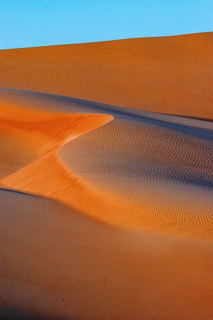 I have seen many dunes before, but the variety of the Arabian sands is astounding. Size-wise, they ranged from small chest-high ones called baby dunes to giant, sprawling behemoths stretching for kilometers. The sands were multi-hued, starting out white, then moving into yellows, saffrons, reds and russets, orange, and shades of vermilion. We were on an old Bedouin camel caravan route that is primarily used now as a way for 4WD vehicles to venture into and through the Omani part of the Quarter. Often the going was fast as the dunes are separated by vast gravel plains but invariably and eventually we would need to climb over low ridges of the soft and seeming viscous sands. With tires deflated, the climbing was usually easy and the descent exhilarating as we slithered and slide nose-first down the backside of the dunes. After a long day, countless sand dunes that I was aching to stop and explore, and a hundred-plus kilometers we came upon a very small oasis: nothing more than a several thorny acacia trees with a flexible pipe coming out of the ground and perpetually draining into a filled bathtub. The water was just shy of hot and smelled slightly of sulfur but apparently the camels don’t mind. The bathtub was odd, but convenient as a I would use it the next morning. A kilometer or so away was a beautiful dunescape (aren’t they all!) and that was to be out campsite. We climbed a low set of dunes and the guide and drivers parked the vehicles…home!